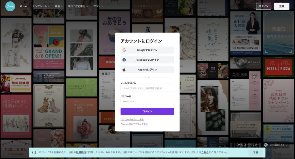 登録していない場合・ログインしていない場合は、以下のような画面が表示されるので、登録する方は画面下部の「Canvaは初めてですか? 登録」のリンクをクリックして登録し、ログインする方は表示されているいずれかの方法でログインしてください。