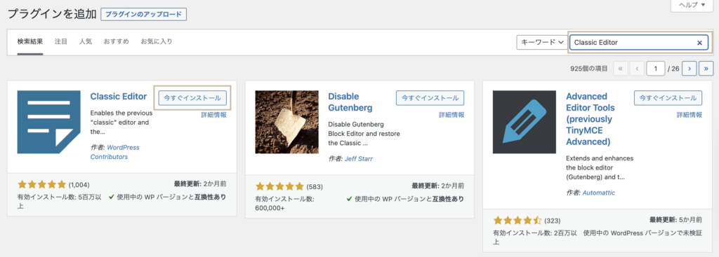 画面右上の検索ボックスで「Classic Editor」を検索する