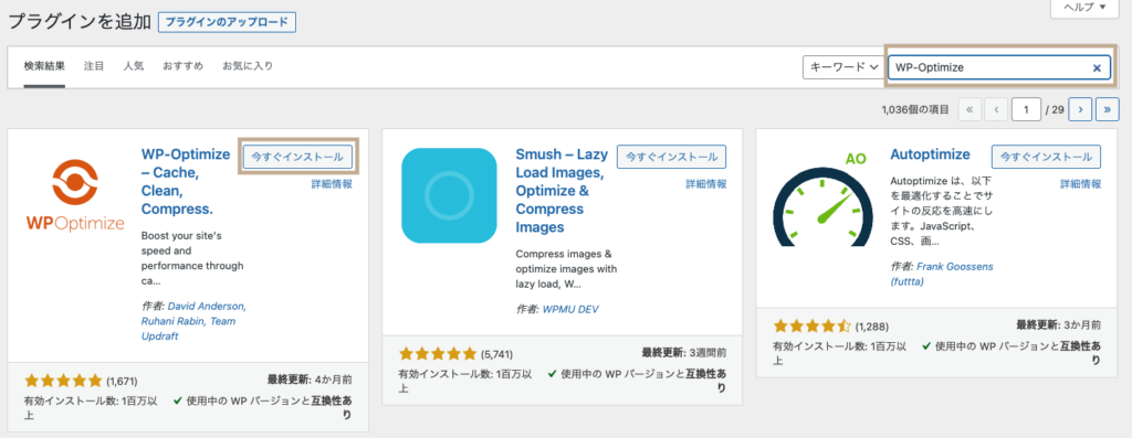 画面右上の検索窓で「WP-Optimize」を検索します。