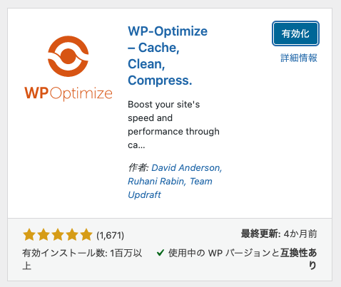 今回使うプラグインは「WP-Optimize」というプラグインです。