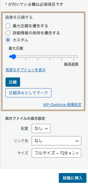 メディアを開き、アップロードしてみると、画面の右側に以下のような圧縮の機能が追加されています。