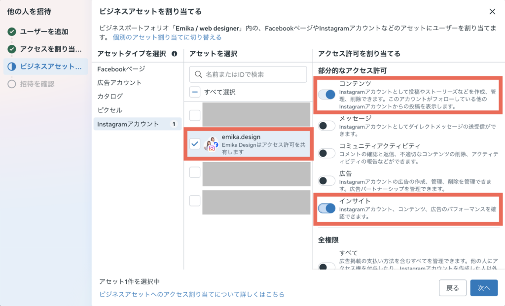 6.該当のInstagramアカウントを選んで「コンテンツ」「インサイト」をONにする