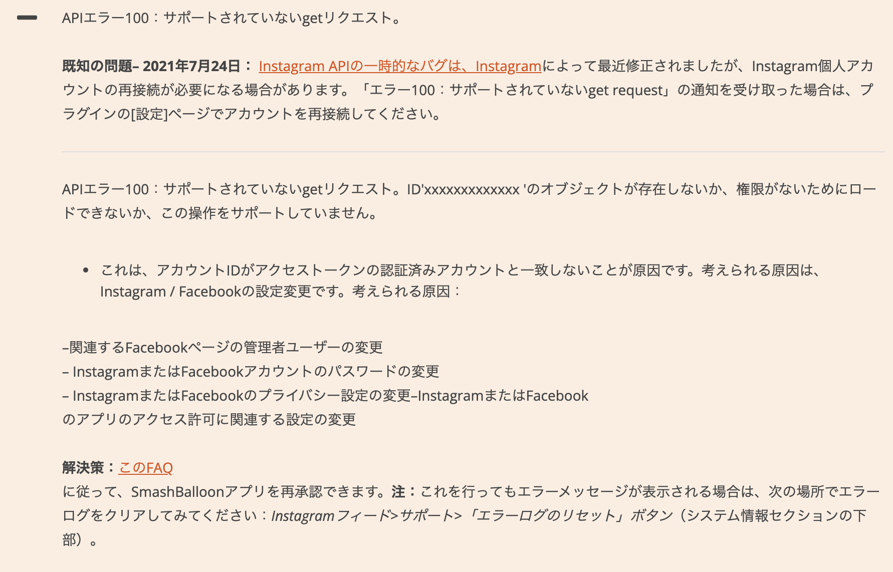 アカウントの連携が切れる原因としては、例えば、複数のサイトで複数のアカウントをInstagram Feedで表示している場合に、アカウントの許可をどちらかで外してしまった時に連携が切れるようです。