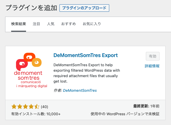 移行元と移行先、両方のサイトに「DeMomentSomTres Export」というプラグインをインストールします。