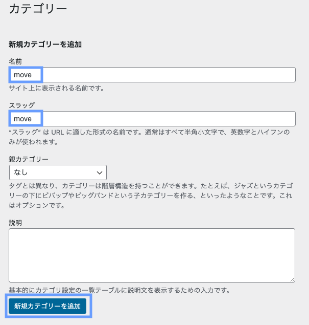 例えば、以下のように、「move」という移行させるカテゴリを作りました。