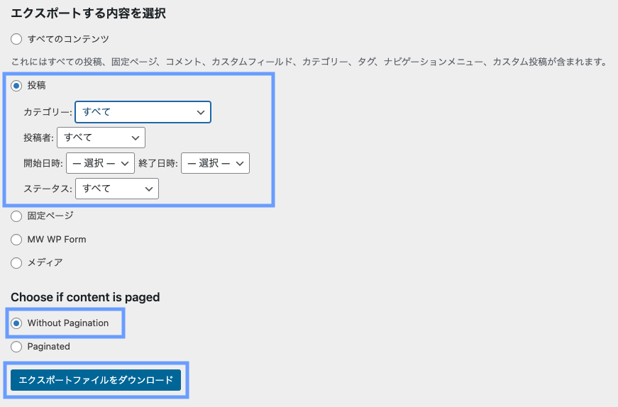 移行元のサイトで移行したい記事をエクスポートしていく設定をしていきます。