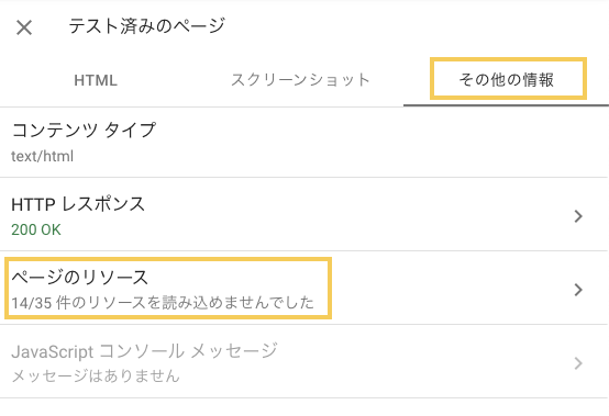 このその他の情報というところを見ると、「◯/◯件のリソースを読み込めませんでした」と表示が出る場合がある。