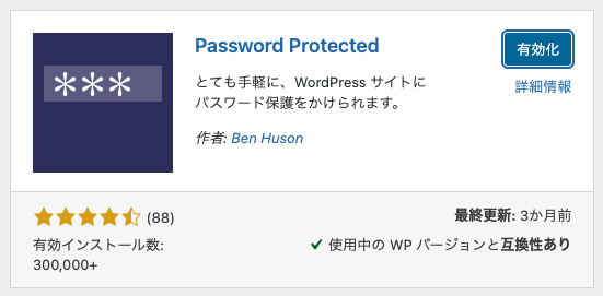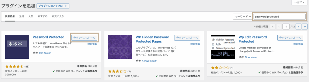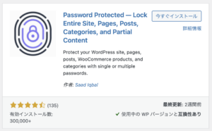 Password Protectedというプラグインが出てきたら、「今すぐインストール」をクリックします。