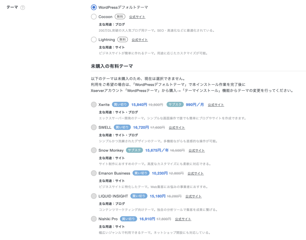 デザインおまかせプランをご希望の方:「WordPressデフォルトテーマ」または「Cocoon」を選んでください。