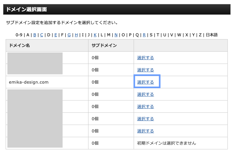 サブドメインを追加したいドメインを選択します。