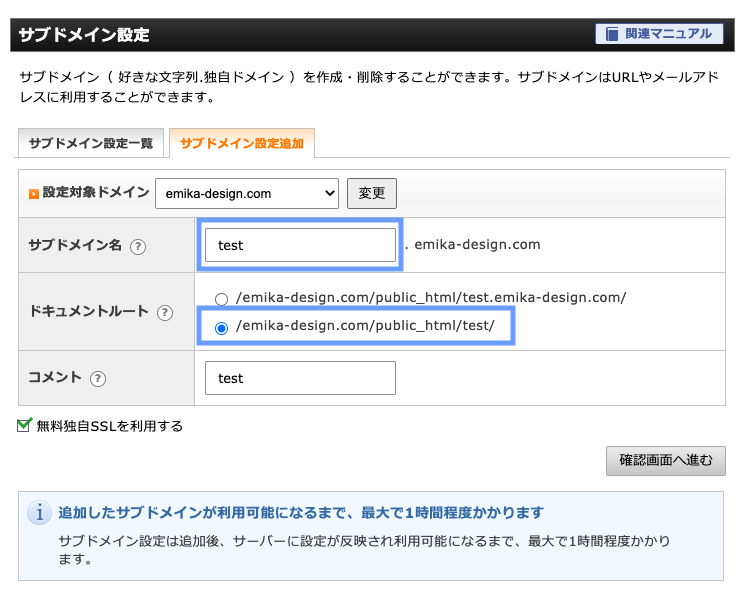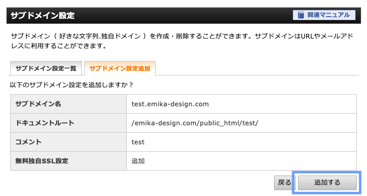 サブドメイン設置追加