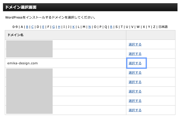 WordPressをインストールするドメインを選択します。