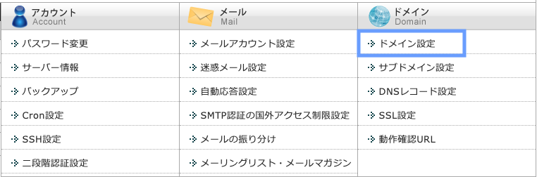 ドメイン>ドメイン設定 をクリックします。