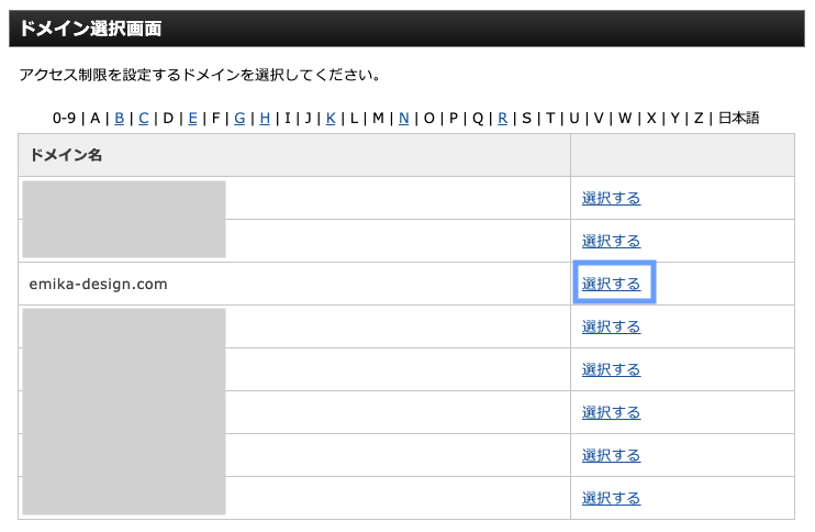 アクセス制限を設定するドメインを選択します。