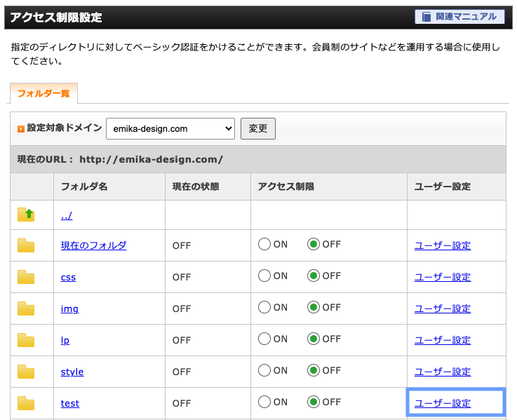 テストサイトだけBasic認証をかけたいので、テストサイトのディレクトリの「ユーザー設定」をクリックします。