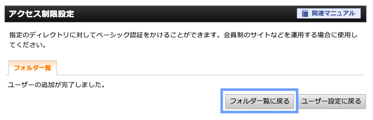 フォルダー一覧に戻ったら、対象のディレクトリのアクセス制限をONにします。
