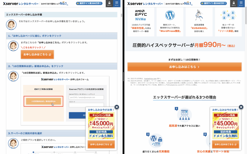 エックスサーバーでは不定期ですが「独自ドメイン永久無料特典(キャンペーン特典)」というキャンペーンや、キャッシュバックキャンペーンが行われているので、それらをうまく活用しながら設定する方法をお伝えします。